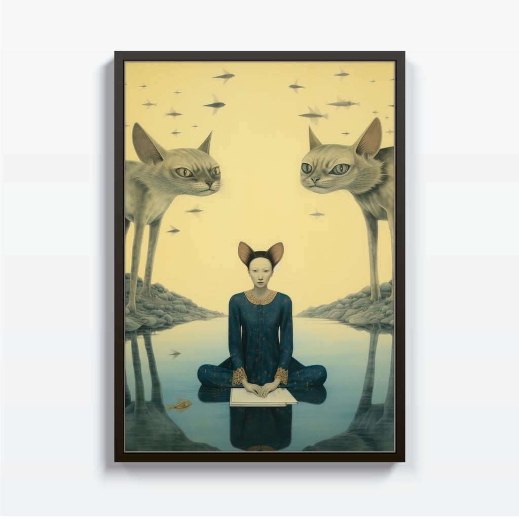 Explora lo surreal y lo místico con Meditación Felina, una pieza que fusiona serenidad, introspección y simbolismo fantástico. En un escenario onírico, una figura humana con rasgos felinos se encuentra en profunda meditación, flanqueada por dos imponentes gatos guardianes que parecen vigilar el umbral entre la conciencia y el subconsciente.