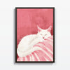 Esta obra transmite ternura y serenidad a través de la figura de un gato blanco descansando plácidamente sobre un fondo en tonos rosa suave. La composición combina delicadeza visual con una atmósfera cálida, creando una escena que invita al descanso y a la contemplación.